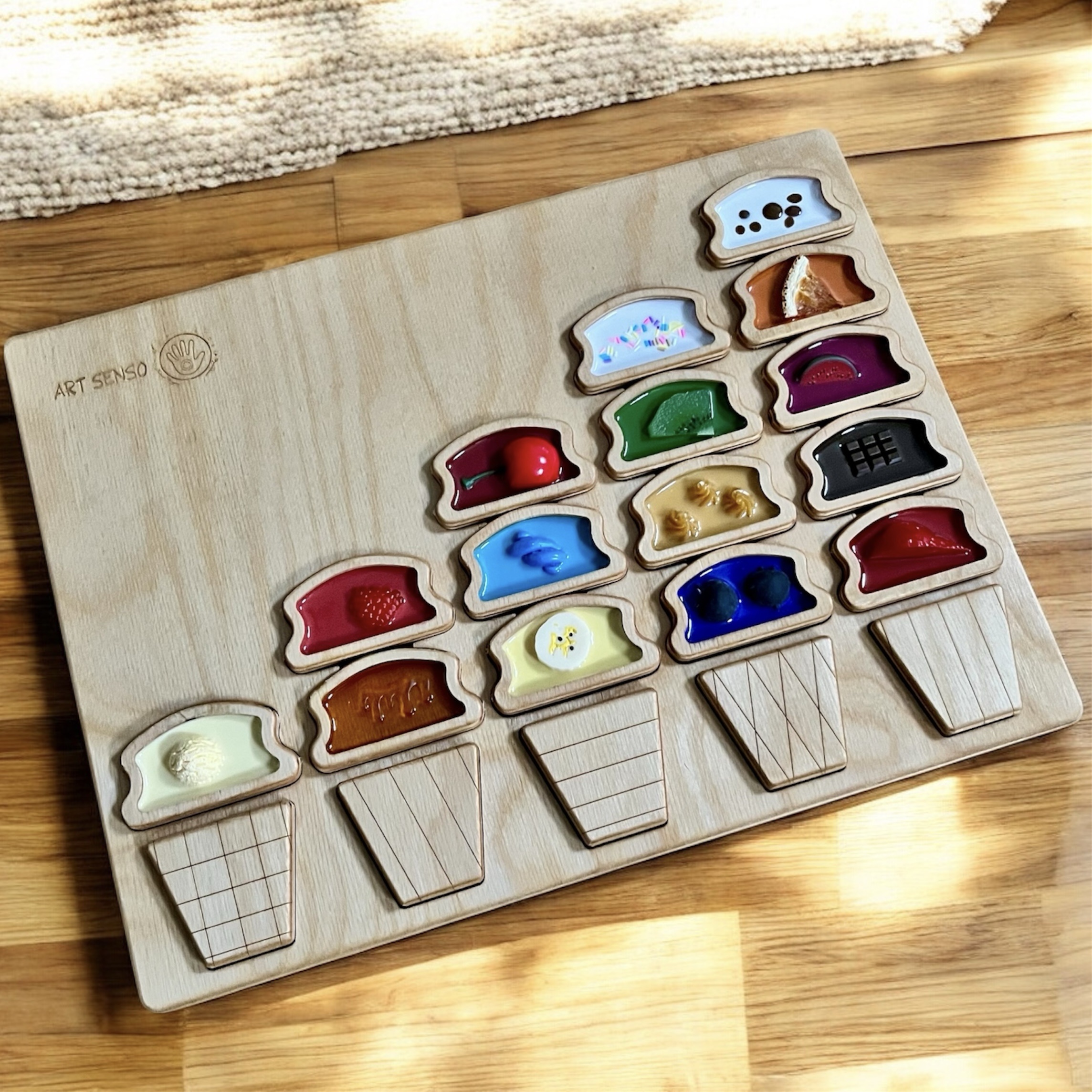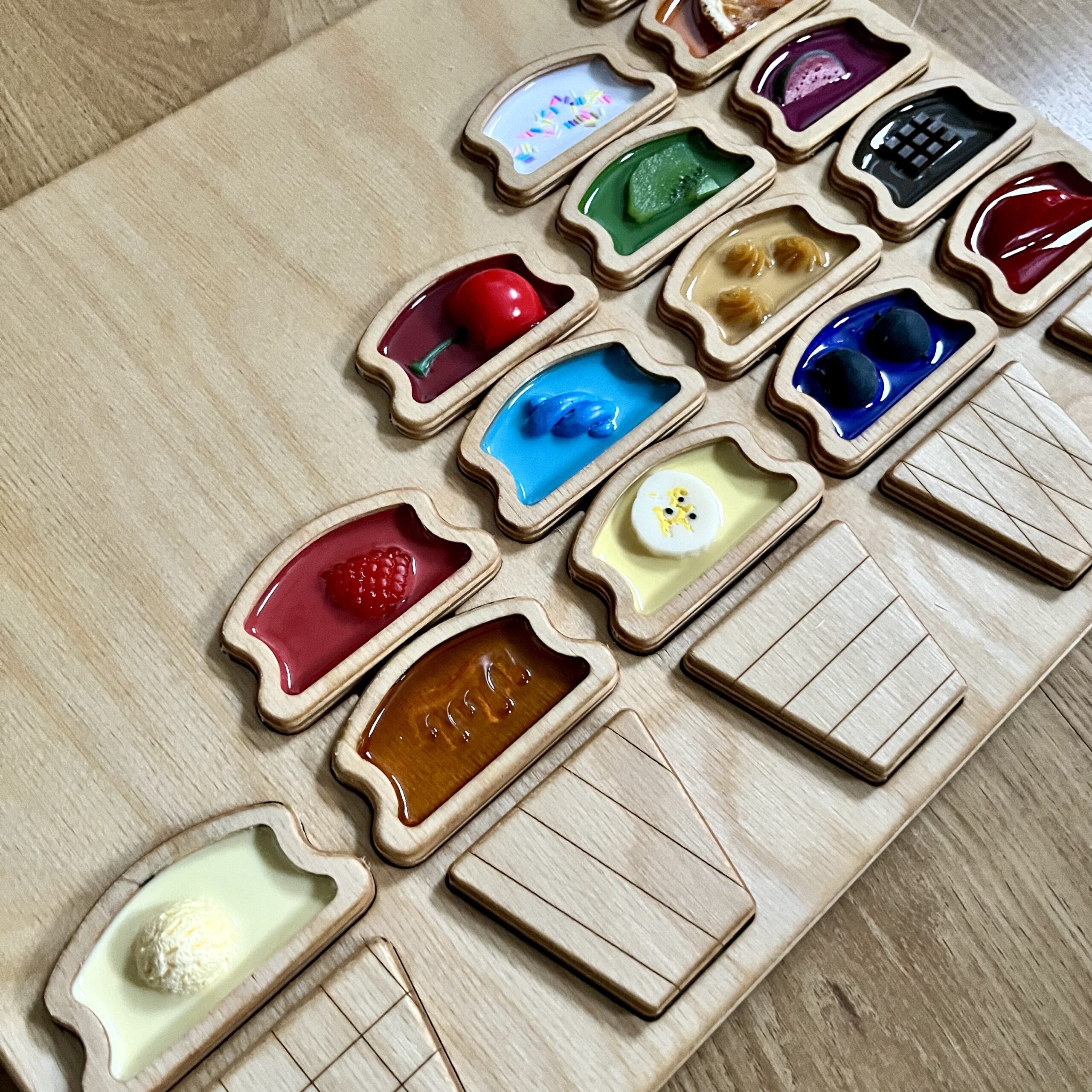 Poznaj wyjątkową drewnianą układankę sensoryczną Montessori inspirowaną słodkimi babeczkami o różnych „smakach” i fakturach!
