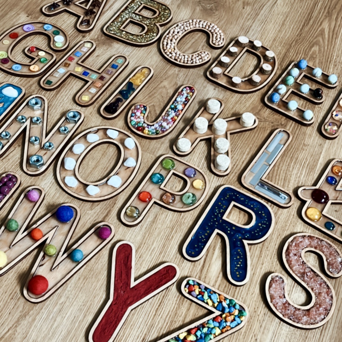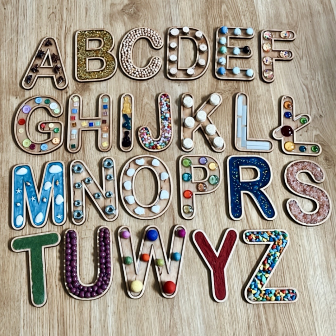 Poznaj Sensoryczny Alfabet – wyjątkową pomoc edukacyjną, która łączy naukę liter z doświadczeniem sensorycznym. Każda z 24 liter została starannie wykonana z różnorodnych materiałów, takich jak drewno, brokat czy ciecierzyca, co stymuluje zmysł dotyku i wzroku dziecka.