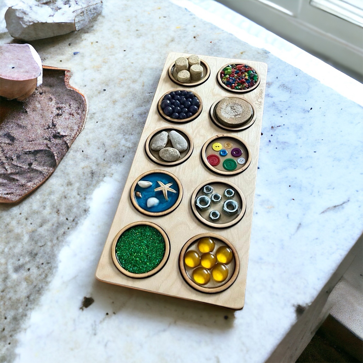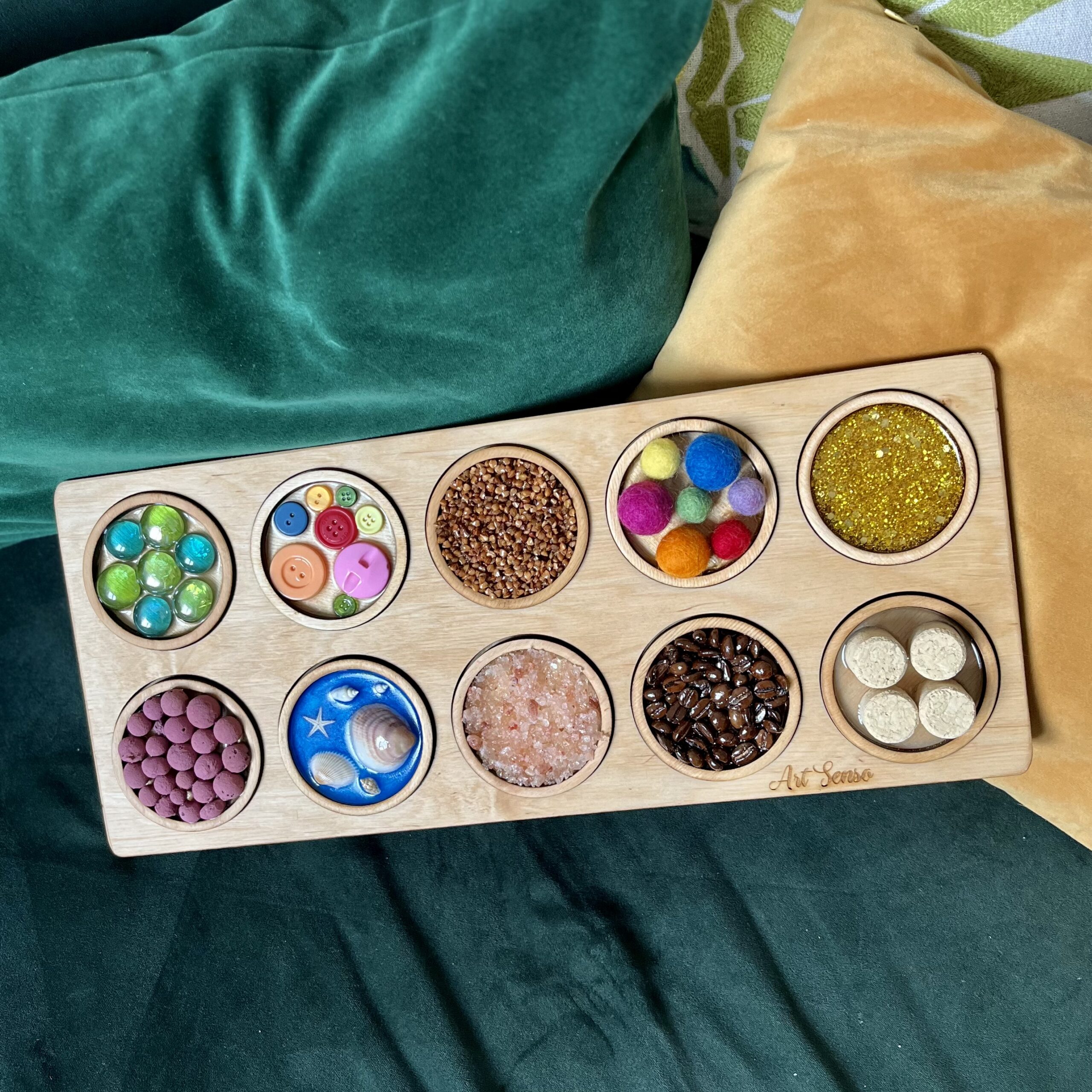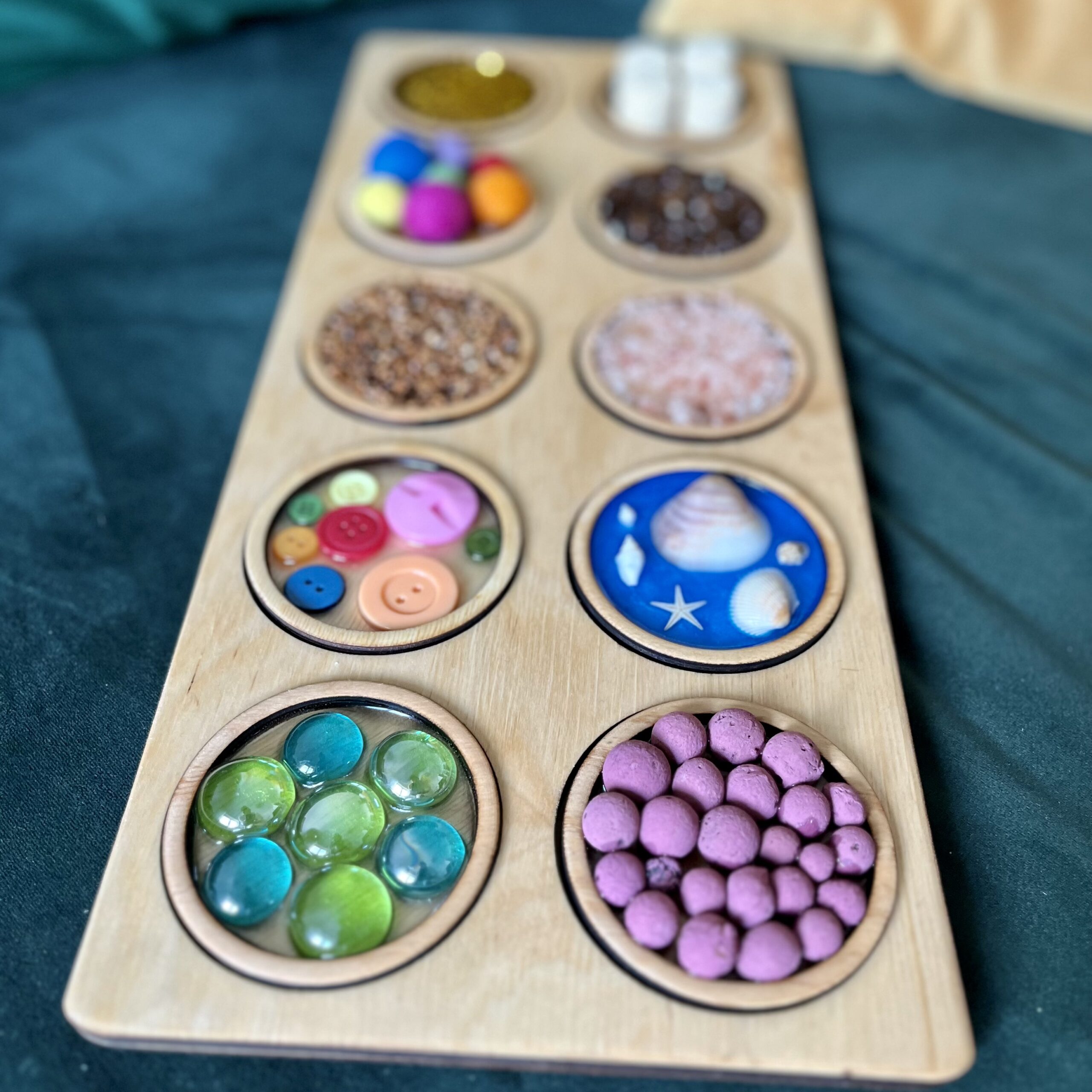 W pakiecie mamy 10 sztuk paneli okrągłych (7 cm średnicy) na tacy wypełnionymi różnymi fakturami, tak, aby w jak najlepszy sposób doświadczyć poprzez dotyk jak najwięcej.